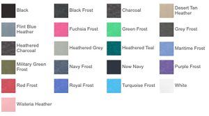 | Color | Black, Black Frost, Charcoal, Desert Tan Heather, Flint Blue Heather, Fuchsia Frost, Green Frost, Grey Frost, Heathered Charcoal, Heathered Grey, Heathered Teal, Maritime Frost, Military Green Frost, Navy Frost, New Navy, Purple Frost, Red Frost, Royal Frost, Turquoise Frost, White, Wisteria Heather |